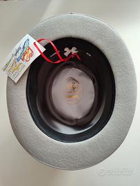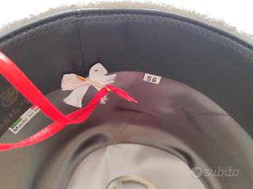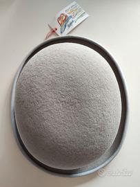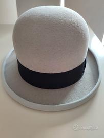 Cappello Bombetta, nuovo e con etichetta, prodotto artigianale made in Italy realizzato su misura da Cappelliera Melegari di Milano, in puro feltro di lana, mai utilizzata, altezza cupola circa 12/13 cm, circonferenza 56 cm, foderata e con marocchino in pelle tergi sudore. Colore grigio, nastro nero di 5 cm.