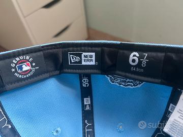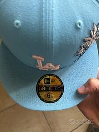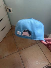 Cappello New Era 59FIFTY originale, in una bellissima colorazione celeste con dettagli rosa. Misura 6 7/8, vestibilità fitted (strutturata), perfetta per chi cerca un look pulito e deciso. Il modello 59FIFTY è iconico, con visiera piatta e qualità premium garantita New Era.