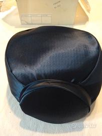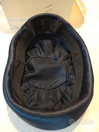 Cappello in raso blu con veletta, completo di scatola originale. La veletta è staccata dal cappello. Primi anni 90. In ottime condizioni.