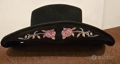 Cappello stile cowboy/western color nero dal design elegante con ricami fiorati sui toni del rosa, molto originale acquistato in America.