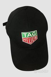 cappello da baseball TAG Heuer, promozionale VIP o un articolo in edizione limitata, nero con il bordo della visiera rosso e presenta il logo TAG Heuer ricamato in verde, bianco e rosso sulla parte anteriore.