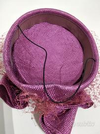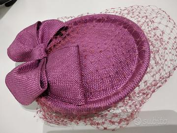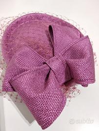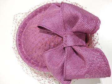 cappellino da cerimonia con grande fiocco e veletta, tinta vinaccia. Materiale 100% paglia naturale effetto tessuto, prodotto made in Italy. Misure cm. 18x15,5. Prodotto ben rifinito e privo di imperfezioni.