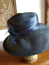 cappello in paglietta blu con ala e nastro e fiocco.