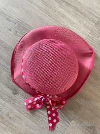 Cappello di paglia estivo da donna di colore fucsia, decorato con un nastro a pois bianchi e fucsia legato a fiocco. Realizzato in paglia intrecciata, tipico dei cappelli estivi per la sua leggerezza e traspirabilità. Mai indossato, pulito e perfettamente intatto.