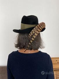Il modello è un Fedora classico con falda media e fascia verde oliva in gros-grain, decorata con piume naturali e una piccola spilla a forma di corno da caccia.