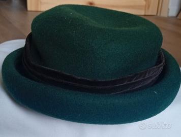 Cappello da donna in feltro verde bottiglia, con nastro marrone , non cucito ,quindi con possibilità di essere rimosso , circonferenza 58 cm