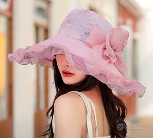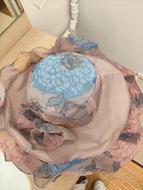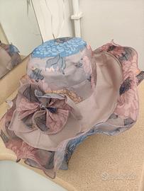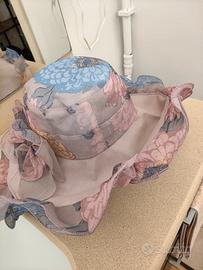 ULTIMO PEZZO di uno Splendido cappello da donna a tesa larga in leggera organza, perfetto per cerimonie, matrimoni o vacanze estive. Il tessuto presenta un raffinato motivo floreale sui toni del rosa e dell'azzurro. Materiale Intelligente: Il cappello è realizzato con una rete rigida indeformabile. Eventuali pieghe dovute alla spedizione spariscono naturalmente appena estratto dall'imballaggio. Manutenzione Facile: Se necessario, la tesa può essere "stirata" e modellata semplicemente con un leggero getto di vapore (ferro da stiro a distanza), tornando come nuova in pochi secondi. Dettagli: Tesa ampia con bordo ondulato, grande fiocco decorativo laterale e interno in rete traspirante. Include un comodo laccetto sottogola regolabile (rimovibile) incluso nella confezione originale, e un laccio che serve a stringere la larghezza se bisogna, come si osserva nelle foto 9 e 10. Informazioni se volete,sono alla vostra disposizione.