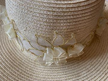Bellissimo cappello estivo in paglia intrecciata color beige con decorazione floreale. Indossato in una sola occasione.