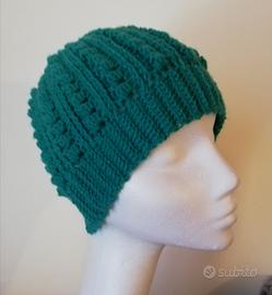 Cappello lavorato a mano all'uncinetto, per donna o adolescente. In lana, verde. Morbido ed elastico. Nuovo.