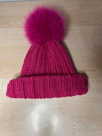 Cappello in lana fucsia con pon pon in pelliccia. Taglia unica.
