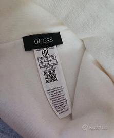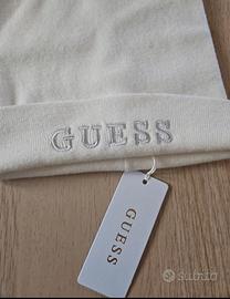 Cappello in maglia Guess, colore bianco. Presenta il logo ricamato sul risvolto. - Logo Guess ricamato. - Design a cuffia.