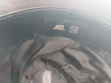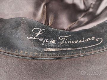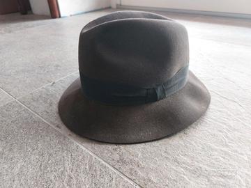 Cappello tipo Trilby, colore scuro (a metà tra il grigio scuro e il marrone) misura 58, in vero e finissimo feltro di lepre, con nastro in gros grain di 4 cm. della stessa tonalità del cappello e marocchino in pelle.