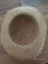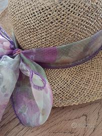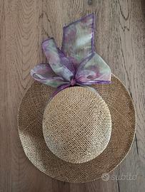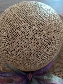 Cappello donna, in paglia naturale intrecciata, con falda di 8 cm., decorato con nastro in tessuto leggero, circonferenza cm. 55.