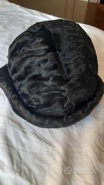 cappello con tesa larga, alta cupola e guarnizione circolare con fiocco nero in Pelliccia di Breitschwanz, foderato