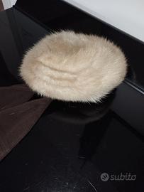 Cappello in pelliccia di visone color miele, foderato, completo di sciarpa di chiusura in lana.
