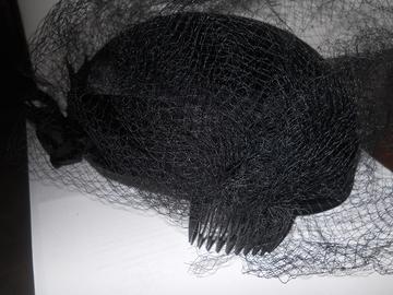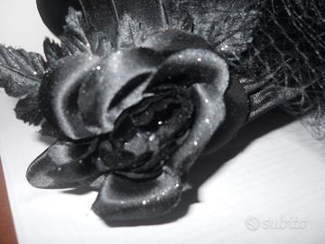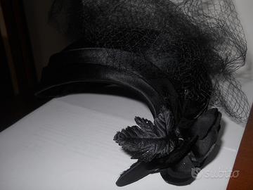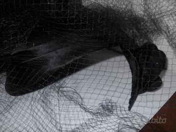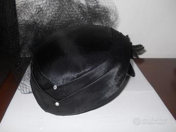 Bellissimo cappellino da cerimonia in raso nero, con veletta, pettinino e strass, nuovo nella sua confezione, mai indossato vendo a 35€+spese di spedizione