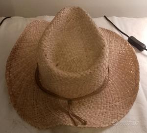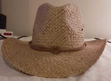 Cappello in paglia stile cowboy, perfetto per completare il tuo look estivo e passeggiate in montagna. - Materiale: paglia intrecciata - Dettaglio: fascia in similpelle con logo - Design: tesa larga e cupola classica. - Taglia 60 cm