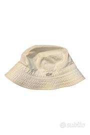 Bucket hat originale Lacoste, colore bianco, 100% cotone, modello F5936. Logo coccodrillo ricamato sul fronte, stile casual perfetto per primavera/estate.