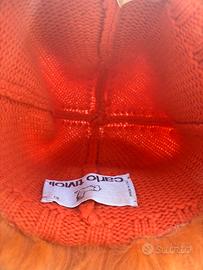Realizzato interamente a mano in Italia, questo cappello combina una pelliccia pregiata (dai toni arancio e nero, probabilmente tinta artigianalmente) con una base in 100% cashmere lavorato a maglia, in un audace arancione intenso.