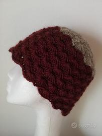 Cappello in pura lana vergine 100%, bicolore beige/bordeaux. Realizzato interamente a mano all'uncinetto. Misura donna o adolescente. Caldo e morbido. Assolutamente nuovo.