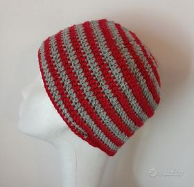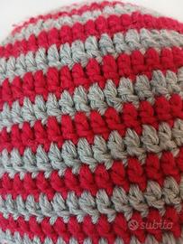 Divertente cappello in lana, realizzato a mano all'uncinetto. Bicolore grigio/rosso. Lavorazione a spirale partendo dal centro della cupola. Assolutamente nuovo, mai usato.