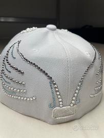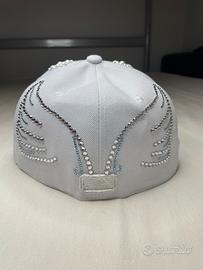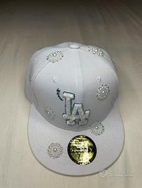 Base bianca con logo *LA* ricamato, impreziosito da applicazioni artigianali con perle e strass su tutta la calotta e la visiera.