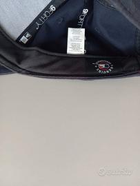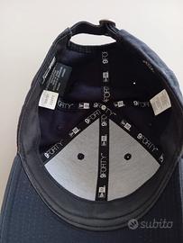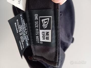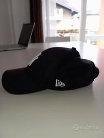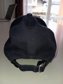 Cappello New Era con visiera a becco, colore blu navy, logo bianco, chiusura regolabile, con etichette interne e usato bene