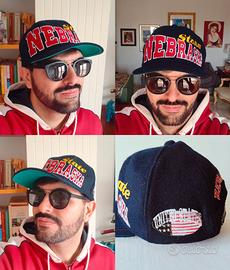 Snapback vintage anni '90 dedicato allo stato del Nebraska, con grande ricamo di alta qualità in rilievo nei colori rosso, bianco e giallo