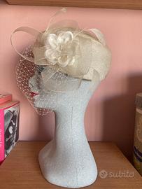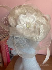 Tamburello sposa color avorio. È presente una veletta, sul lato una composizione con un fiore, piume e nastro, all’interno è presente un elastico nero. Prodotto Made in Italy, nuovo, mai usato
