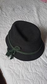Vendo cappello tradizionale tirolese usato, in feltro di lana color verdone con cordoncino e nappa. Marca,indicata nell'interno, Garmisch Import con etichetta interna che mostra vecchio stemma della città. Si presenta in ottime condizioni salvo per un angolo della etichetta interna un po' scollato e rovinato da un lato.