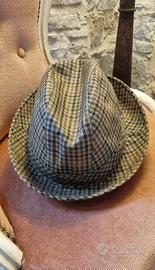 Elegante cappello fedora Saxony Look, realizzato in pura lana con fantasia pied de poule nei toni del marrone, verde e beige.