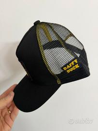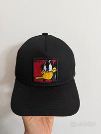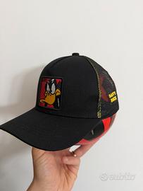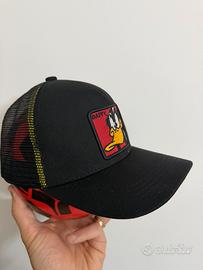 Vendo bellissimo cappello modello trucker (con rete posteriore traspirante) del brand Capslab, con patch ricamata di Daffy Duck dei Looney Tunes. Il cappello è di colore nero con dettagli rossi e cuciture gialle neon sul retro, come mostrato in foto. La patch anteriore è su base rossa con la scritta "DAFFY" e il personaggio dei cartoni animati. È un accessorio perfetto per completare un outfit streetwear o per collezionisti di merchandising dei cartoni animati anni '90. Il cappello è stato usato pochissimo ed è in condizioni eccellenti
