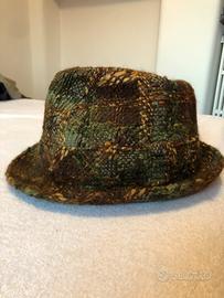Modello fedora a tesa corta, realizzato in tweed di lana bouclé nei toni del verde, ocra e marrone.
