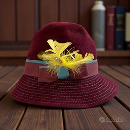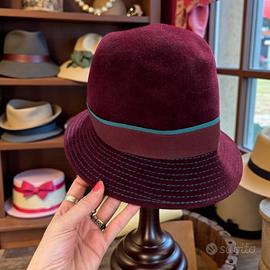 C’è un momento, nelle vecchie cappellerie, in cui il cappello giusto sembra aspettare solo la testa che saprà portarlo. Questo cloche color borgogna nasce per quello spazio sospeso tra eleganza e carattere. Il feltro compatto disegna una linea morbida ma decisa, mentre la fascia in gros-grain, rifinita da un profilo verde petrolio, introduce un contrasto colto, mai gridato.