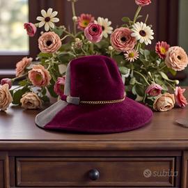 Cappello donna Marone 1881. Feltro di lana. Design bicolore. Catena decorativa in metallo dorato. Tesa medio-ampia. Stile elegante e contemporaneo, taglia M.