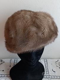 Elegante cappello vintage in pelliccia marrone, dalla forma rotonda compatta, stile colbacco. La pelliccia presenta una texture densa e morbida, con sfumature naturali dal castano chiaro al cioccolato.