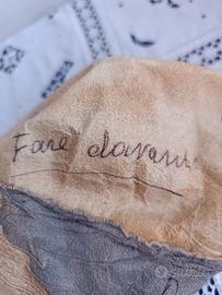 All’interno sono visibili scritte a mano (“davanti”, nomi e note sartoriali) che testimoniano una lavorazione artigianale su commissione. Il cappello non è stato rifinito con fodera, quindi rimane incompiuto: un dettaglio che ne sottolinea l’originalità e la rarità.