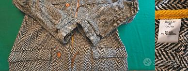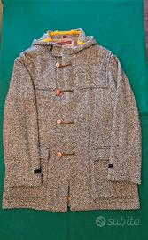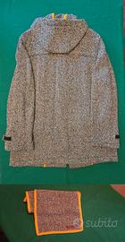 Cappottino Montgomery in lana marca Massimo Rebecchi comprensivo di sciarpa, semi foderato e con cappuccio, colore grigio/nero, taglia 52 (XL). Maniche con strap, bottoni legno e asole in pelle, tasca interna in pelle. La sciarpa è lunga 142 cm x 31 cm.
