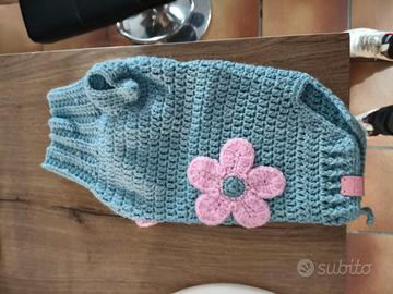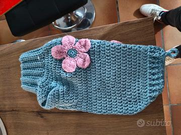 Cappottino artigianale per cani, realizzato interamente a mano all'uncinetto con morbido filato azzurro polvere. Design accogliente e caldo, perfetto per le giornate fredde. Presenta un colletto a coste e una graziosa applicazione a fiore rosa sul dorso. Presente anche una piccola etichetta "Handmade with Love". Ideale per cani di piccola taglia.