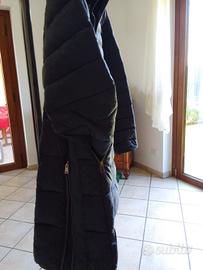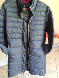piumino imbottito sintetico con cappuccio staccabile Fiorella Rubino, come nuovo, doppia lampo, bottoni, spacchetti laterali, colore blu navy, taglia italiana 35, che equivale ad una taglia 44 circa