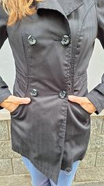 Cappotto a mezza coscia colore nero modello impermeabile trench doppiopetto con tasche anteriori, senza cintura. Taglio classico, peso autunnale. È presente anche un bottone di ricambio inutilizzato. Manica leggermente arricciata a sbuffo.