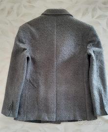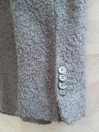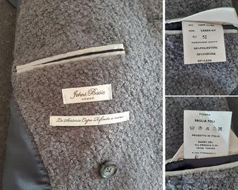 Cappottino uomo in bouclè marca Johns Basic Homme color grigio, taglia 52, modello caban doppio petto, semi-foderato con tasche esterne, come da foto. Composizione tessuto 50% poliestere, 30% viscosa, 20% lana. Dimencioni capo: lunghezza 76 cm, torace 56 cm, spalle 52 cm.