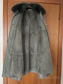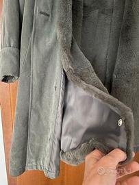 Capppotto alcantara verde oliva con interno in lapin sfoderabile, colletto in pelo staccabile, spalle leggermente imbottite. Taglia 46