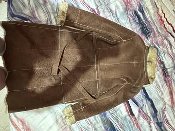 Splendido cappotto firmato Armani Jeans (AJ), modello lungo ed elegante, perfetto per le stagioni fredde. Il capo combina uno stile classico con dettagli moderni e rifiniture di alta qualità. Caratteristiche principali: • Colore: Marrone scuro con interni e rifiniture in pelliccia sintetica color miele/beige. • Design: Modello a vestaglia con cintura regolabile in vita per esaltare la silhouette. • Dettagli: * Ampio colletto in pelliccia. • Grandi tasche applicate sul davanti con logo Armani ricamato su quella sinistra. • Cuciture a vista che donano struttura al capo.