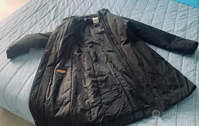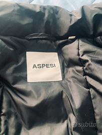Cappotto/piumino Aspesi nero avvitatino. Doppia chiusura (cerniera/bottoni a clic). Indossato 2 volte. Taglia L. Con cappuccio arrotolato sotto al collo (vedi foto). Lunghezza totale 86 cm circa. Punto vita 45 cm circa. Tasche con chiusura a cerniera.