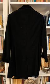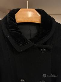 In lana bouclé, sono stati applicati polsi e colletto in velluto e tasche ed è stato affiancato stile redingote.