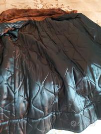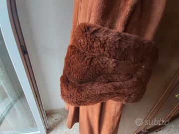 Cappotto in camoscio TG.52, collo scialle con pelliccia come le maniche, chiusura 3 bottoni metallo, foderato trapuntato, modello ampio. Lunghezza cm.114, spalle cm.52, vita cm.146