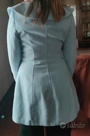Cappotto azzurro dal particolare collo sciallato, bottone con rosa bianca. Leggermente sancrato e senza tasche