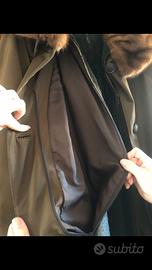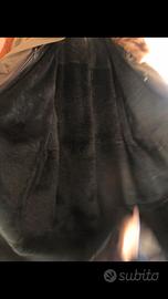 Cappotto da donna con polsini e girocollo in pelliccia di visone. È un 4 stagioni perchè la parte interna può essere rimossa con una cerniera. L’interno è di pelliccia nera di coniglio, quest’ultima ha un leggero diradamento in zona collo/spalle. Veste circa una 48