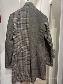 Cappotto corto con collo alla coreana ricami floreali rosa-amaranto su sfondo tessuto grigio metà uniforme metà principe di galles - capo versatile che abbina il floreale romantico al sobrio geometrico - tessuto misto lana 34%